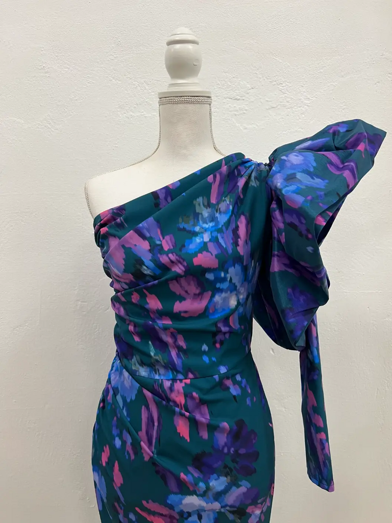 Vestido para evento de corte midi, asimétrico, con una manga larga con volante y frunce lateral en el vestido, en el lado en el que no se encuentra la manga.