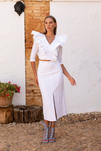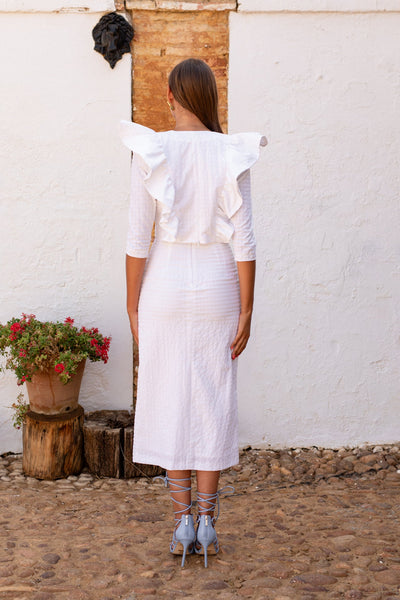 Conjunto para evento, compuesto de cuerpo con manga francesa, con volantes laterales y falda de vichy con abertura en el delantero y cierre mediante cremallera invisible. Elaborado con tejidos ecológicos.