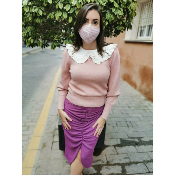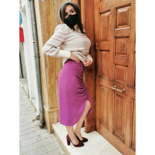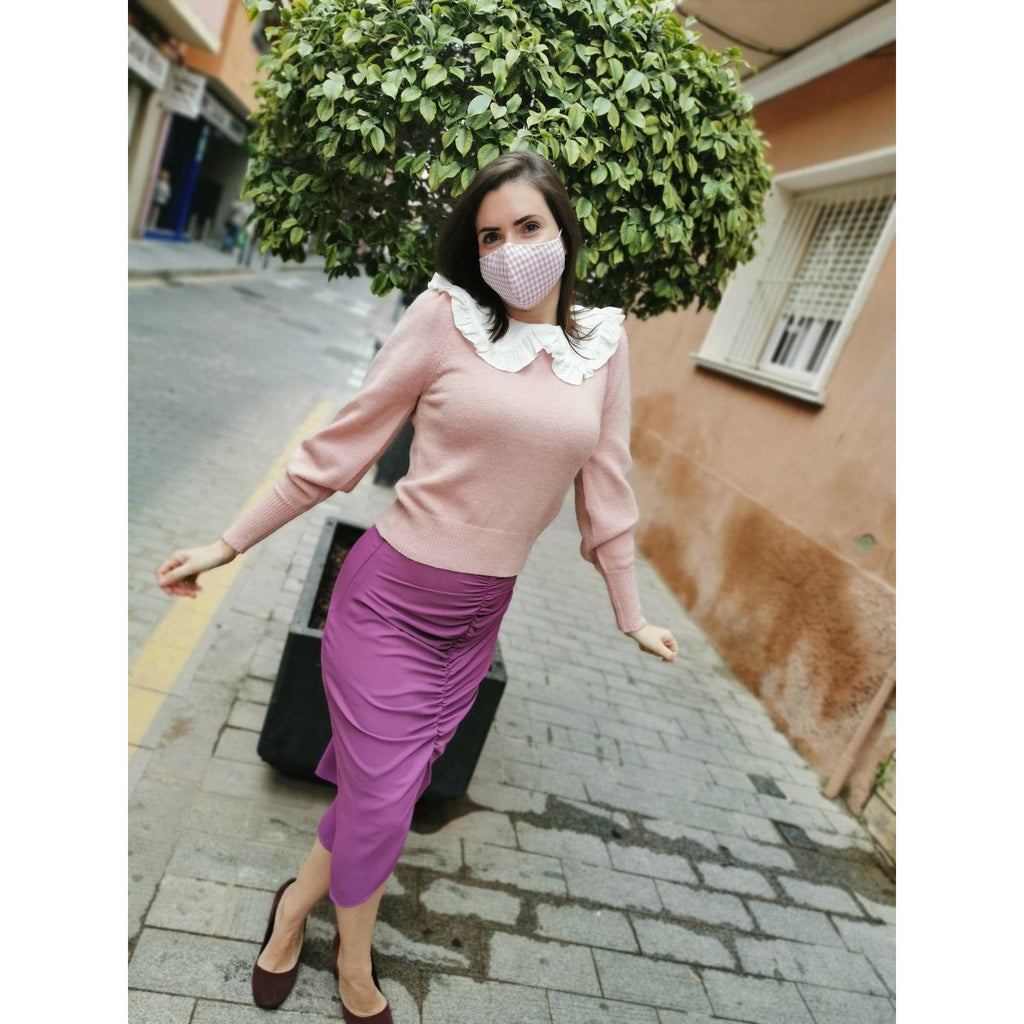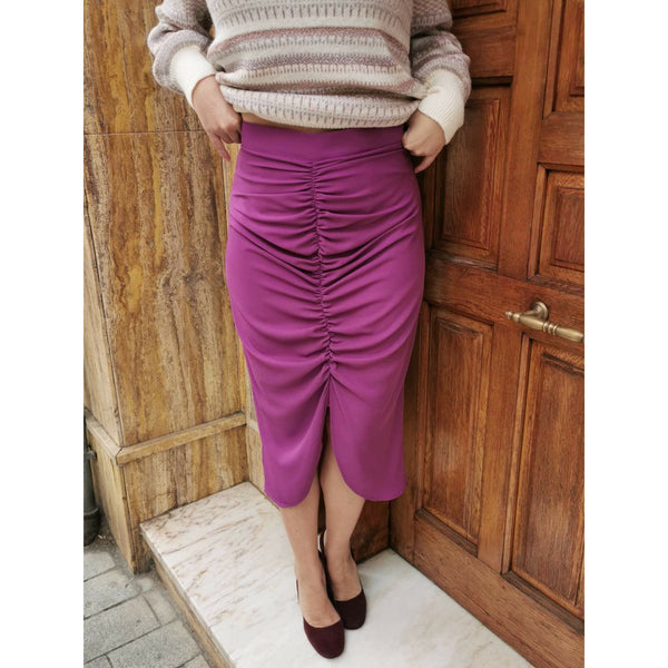 Falda larga de gasa, con frunce en el centro delantero con abertura en el bajo también por el delantero y cinturilla con un ancho de 4,40cm.