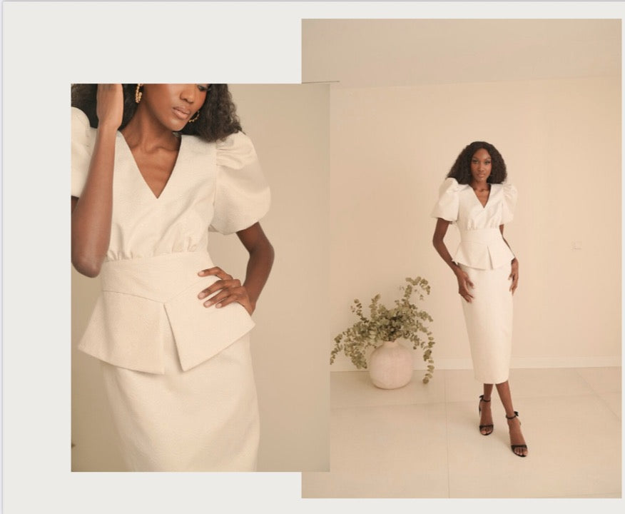 Con manga corta abullonada y peplum.