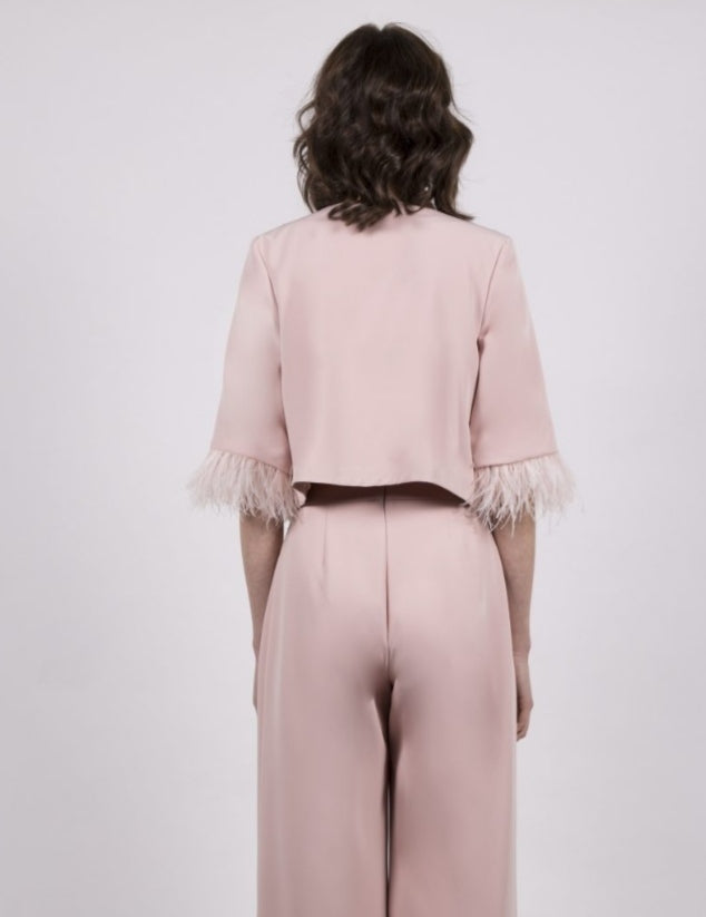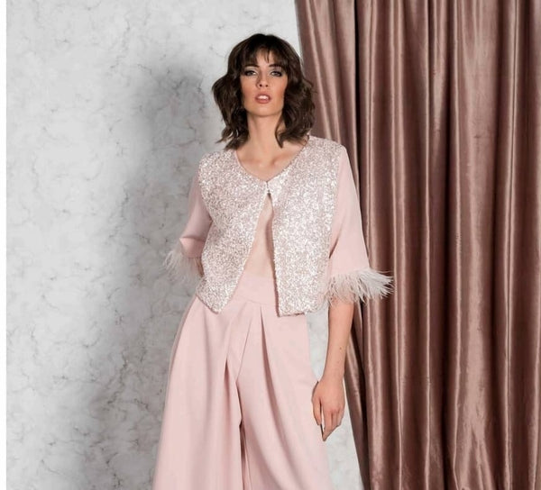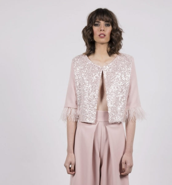 Torera elaborada en la parte delantera con lentejuelas en la zona de cuerpo y en la parte trasera y mangas con crepé liso en rosa vintage, forrada con un tejido de viscosa en la misma tonalidad.