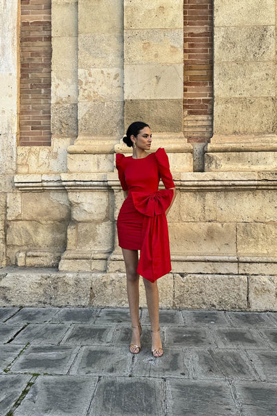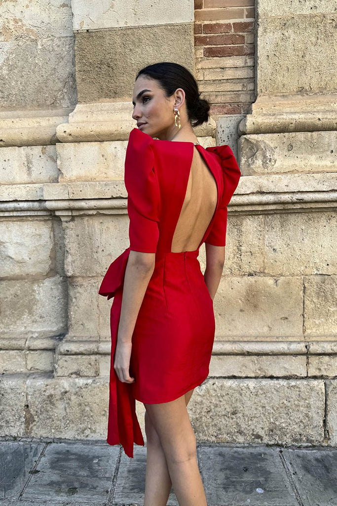 Vestido de invitada, perfecto para todo tipo de eventos. Ha sido elaborado en tejido bioelástico y tafeta. Amplio escote en la espalda, acabado con botón dorado.