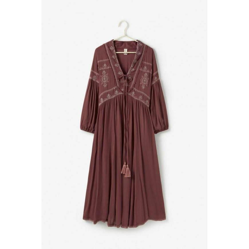 Vestido largo y manga larga con bordado floral en la parte superior. Lazo anudado a la altura del pecho. Mangas abullonadas y silueta fluida. - Maxi vestido - Manga abullonada - Escote en pico - Lazo a la altura del pecho acabada con pompones